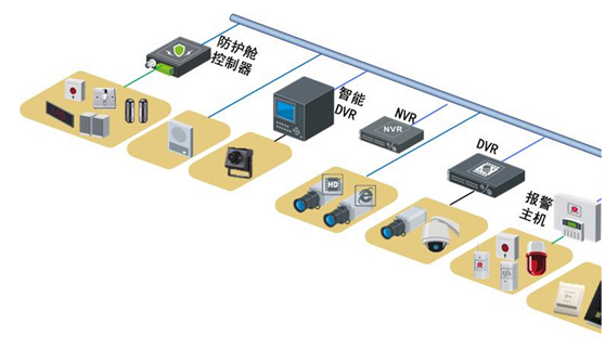 自助銀行/ATM智能監(jiān)控系統(tǒng)一般分為視頻監(jiān)控系統(tǒng)、入侵報警系統(tǒng)、語音對講系統(tǒng)、防護艙控制系統(tǒng)等,系統(tǒng)架構如下圖所示: