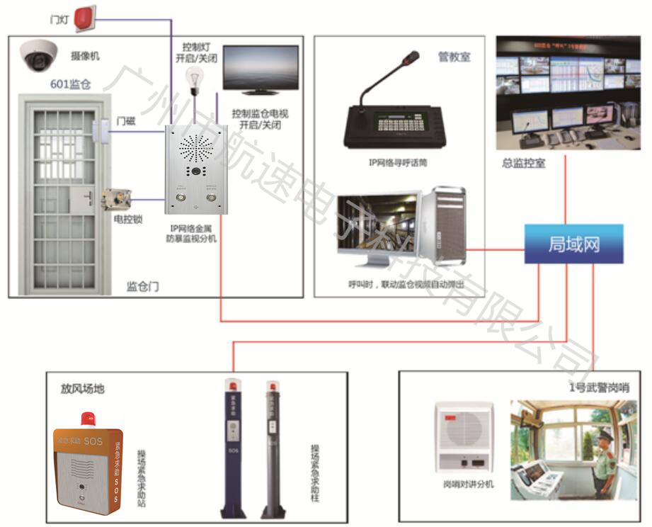 針對監(jiān)獄對講、監(jiān)聽監(jiān)視、廣播、可視、緊急求助、報(bào)警及錄音錄像高度集成的七合一系統(tǒng)要求借助監(jiān)獄內(nèi)部網(wǎng)絡(luò)通信,“航速”公司利用內(nèi)部網(wǎng)絡(luò)設(shè)計(jì)一套全數(shù)字IP網(wǎng)絡(luò)對講系統(tǒng)。該系統(tǒng)要求與監(jiān)獄的視頻監(jiān)控系統(tǒng)、應(yīng)急報(bào)警、周界防范、公共廣播、門禁控制、電子地圖等管理系統(tǒng)集成安防綜合管理平臺,實(shí)現(xiàn)一體化、數(shù)字化、集成化的高效管理平臺系統(tǒng),提升監(jiān)獄的綜合管理水平,實(shí)現(xiàn)依靠科技強(qiáng)警,向科技要警力,建設(shè)監(jiān)管基礎(chǔ)設(shè)施,并聯(lián)網(wǎng)接入監(jiān)獄指揮中心,形成快速反應(yīng)的綜合控制安全防范體系。